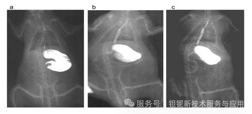 大鼠胃内给药后,30% 稀土TaO₄凝胶在 24 小时内完全排泄,食管、胃、小肠轮廓清晰,对比度维持时间优于钡混悬液(图 7)。