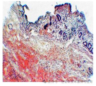 犬胆道造影中,30% 稀土TaO₄可清晰显示直径≥7 mm 的结石,肝内胆管分支显影分辨率达 0.5 mm(图 9)。相比之下,泛影葡胺组黏膜出现大面积坏死,而 稀土TaO₄组仅见轻度淋巴细胞浸润(图 10、图 11)。