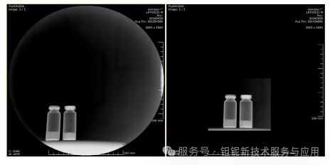图17.含有液体样品的玻璃瓶的射线照相:左边是蒸馏水,底部和壁上含有不溶于水的不透射线物质颗粒。